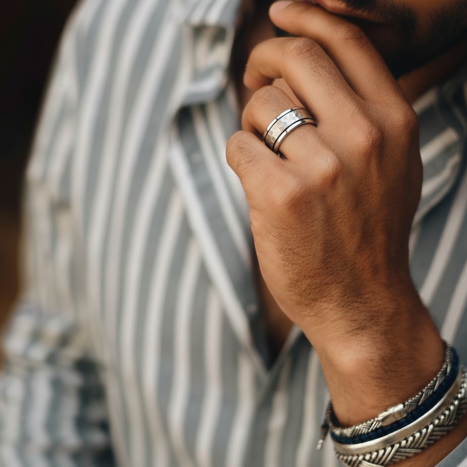 Distinctive & Dynamic Design: Command attention with the ring's captivating hammered texture, offering a unique, rugged aesthetic that reflects an artisan's touch. The contrasting smooth edges frame the textured center, creating a dynamic visual appeal that is both bold and sophisticated. This ring stands out, just like you.